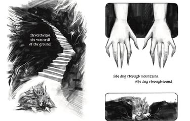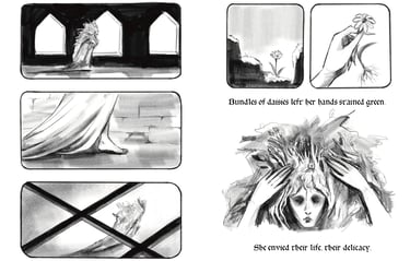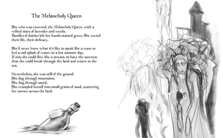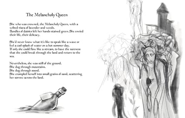 The Melancholy Queen is a 24-page zine and visual poem. It is an exploration of depression and the desire to rid oneself of such a burden.